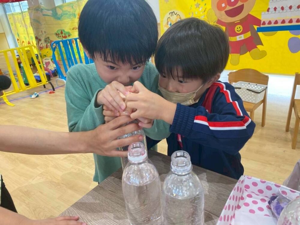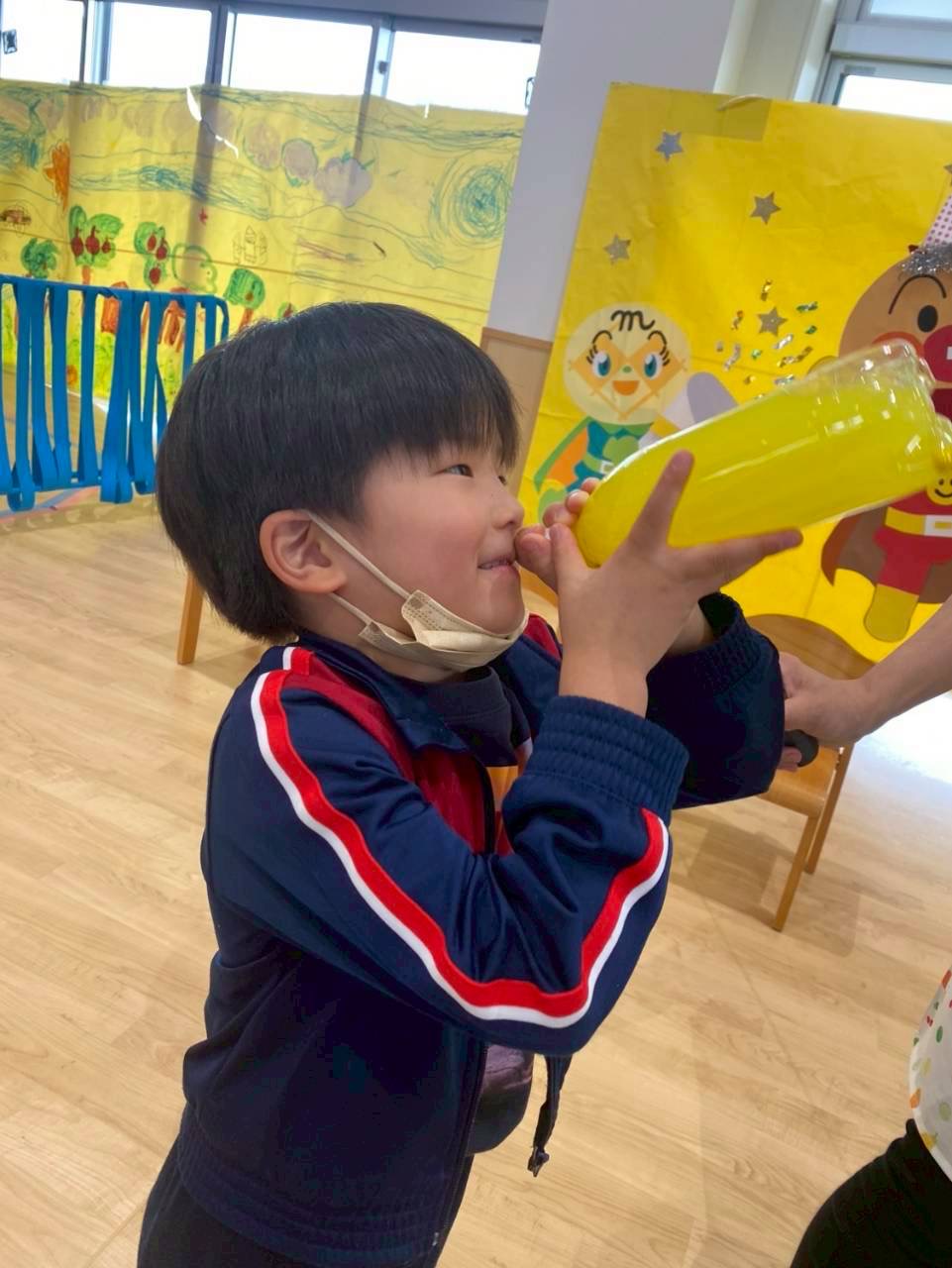 次々に「あった!」と見つけてくれたので、ペットボトルにぎゅーっと果汁をいれて、「美味しくなーれー」と魔法をかけて振ると…不思議‼️