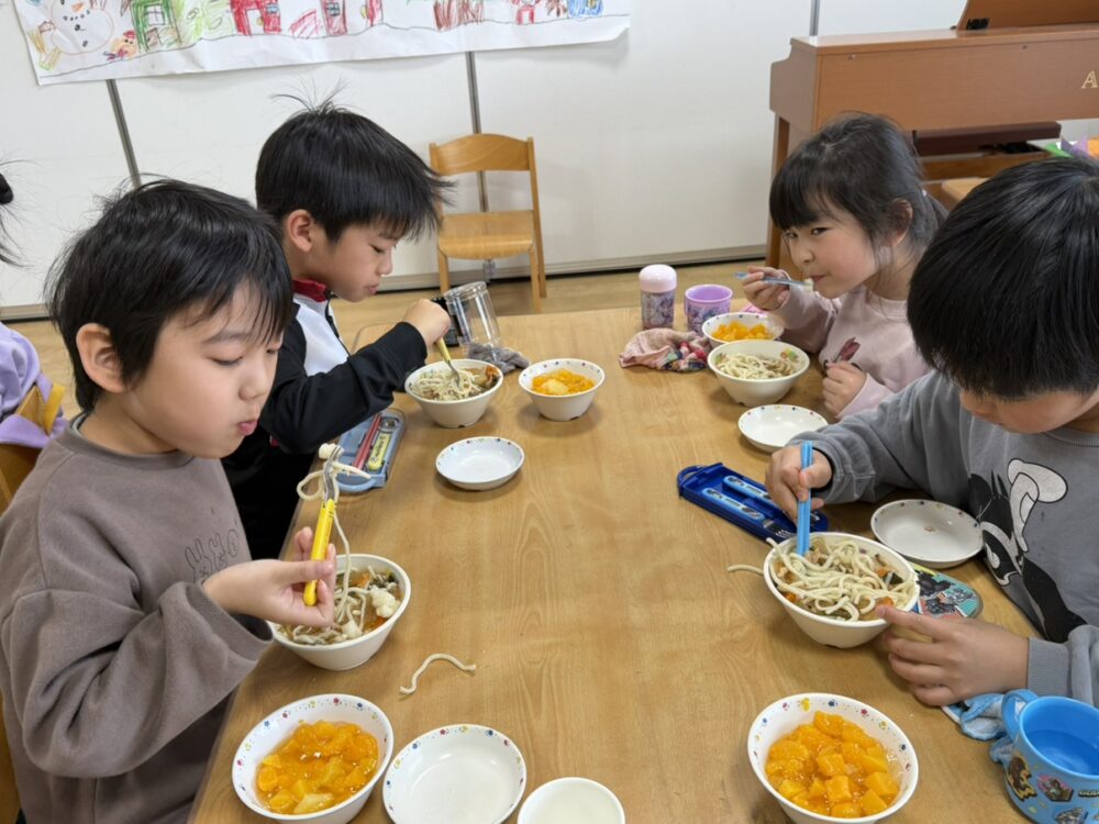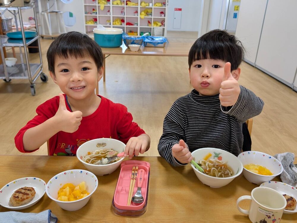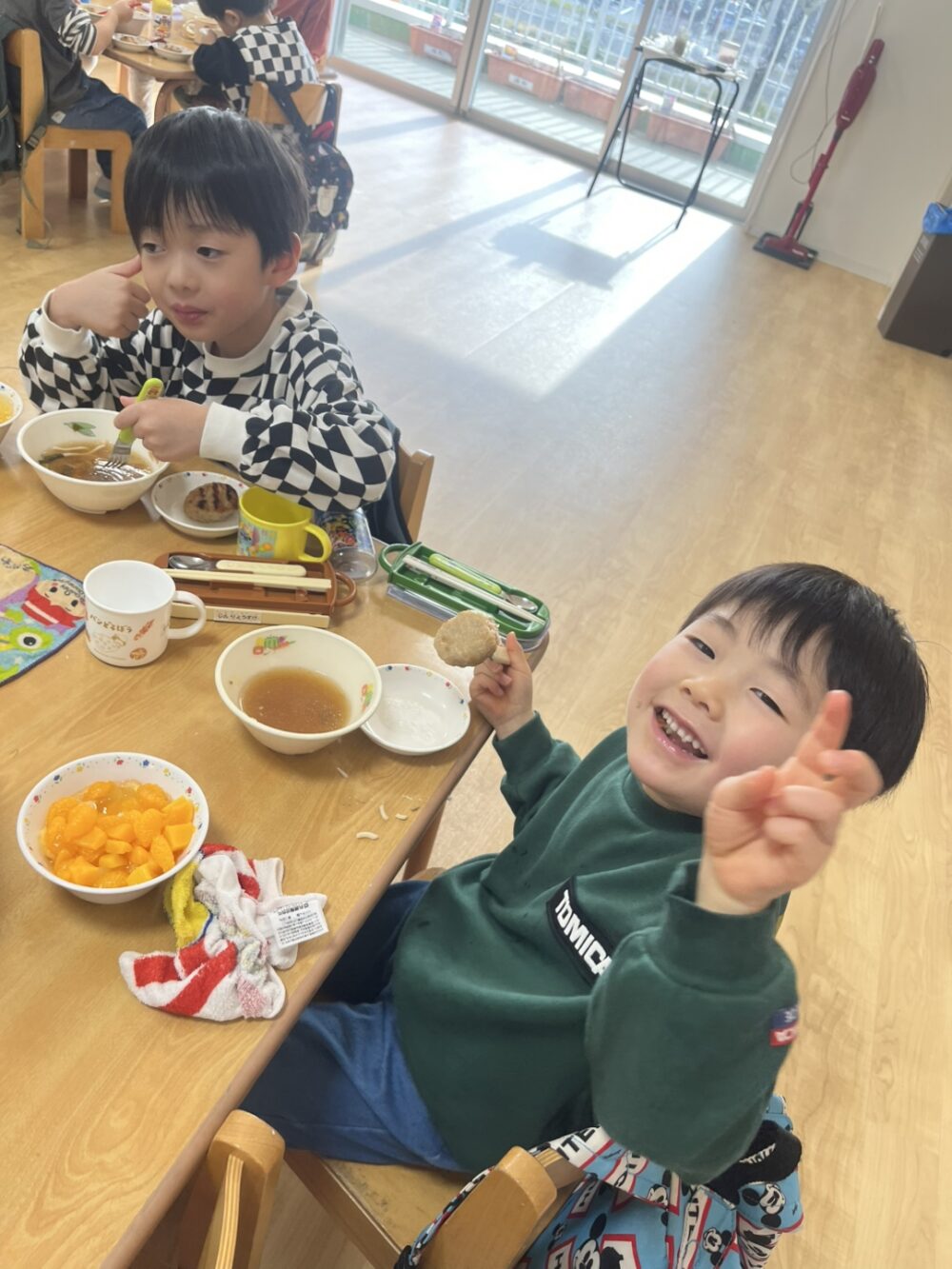 おもちつき終了後は、給食タイム🍡♡ 自分で丸めたお餅をうどんと一緒に美味しそうに食べていましたよ〜〜!🤤