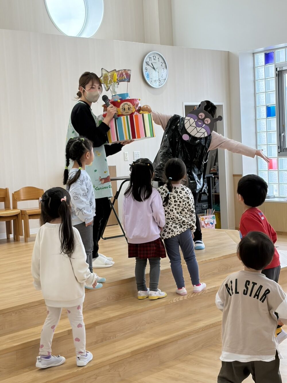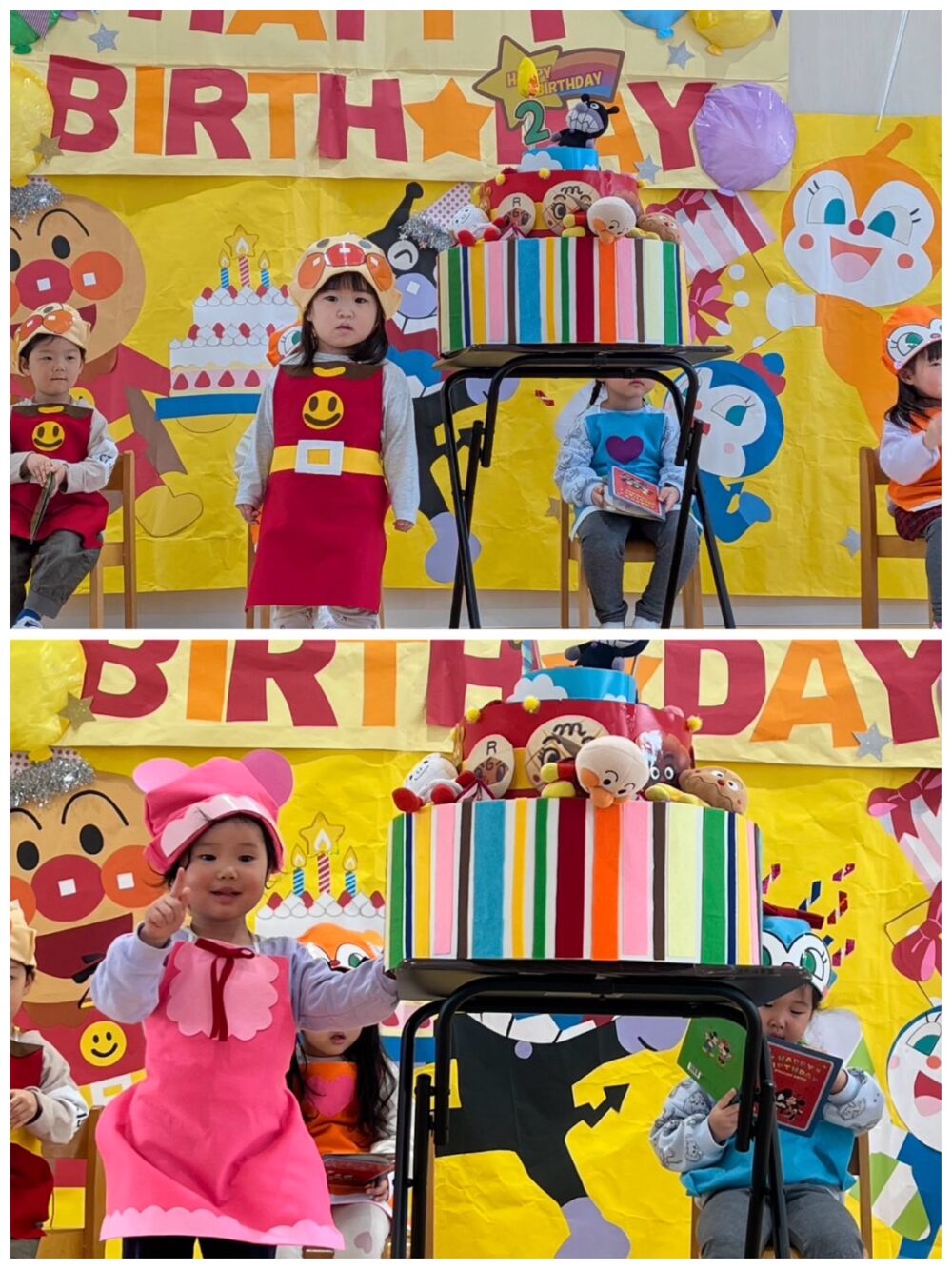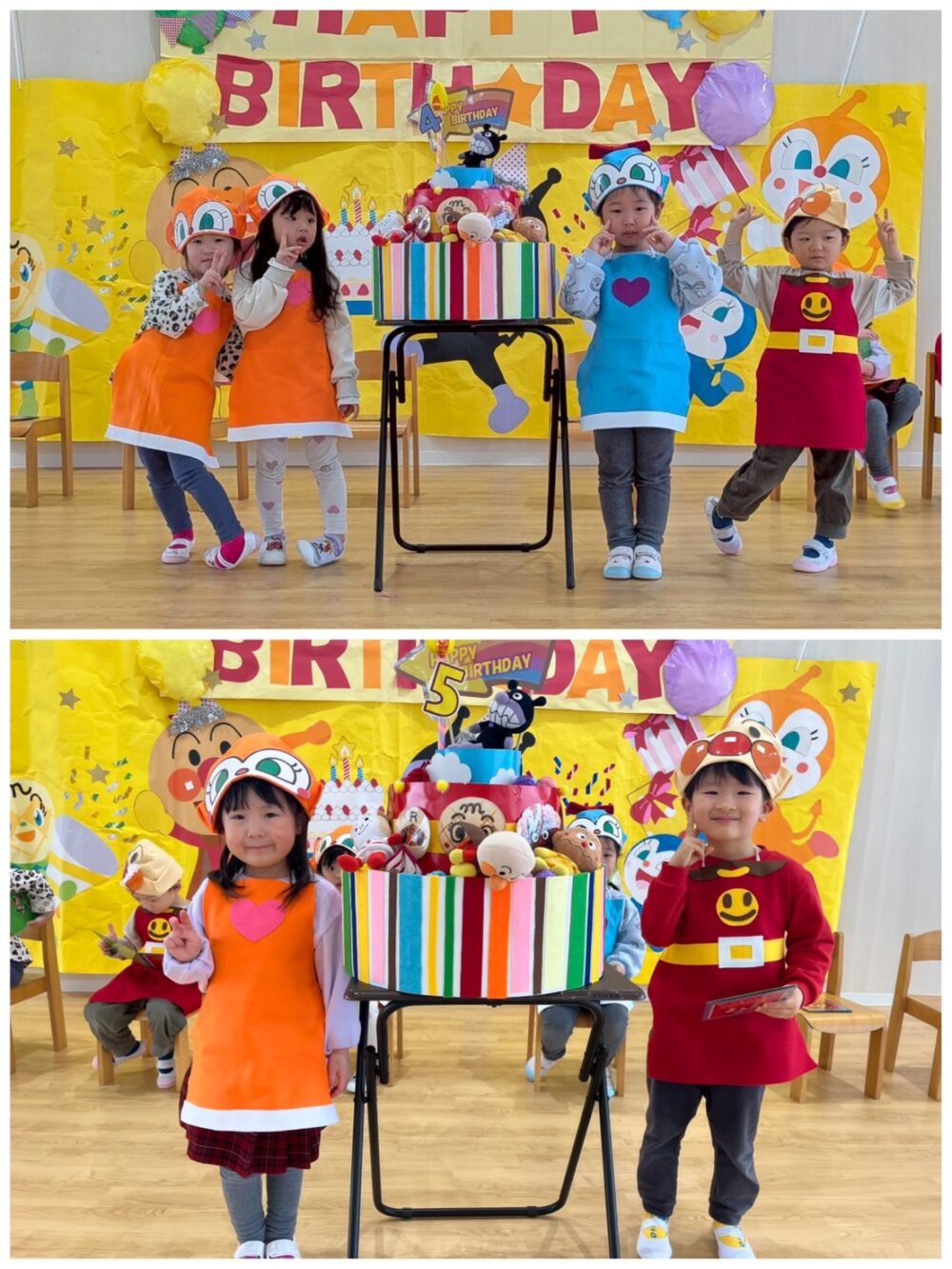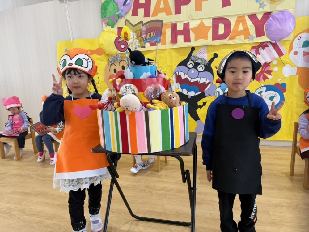 写真を撮った後は、バイキンマンに取られてしまったケーキを取り戻す為、登場したアンパンマンと一緒にクイズに挑戦💌正解するたびに文字カードを集め、誕生児のお友達がパネルに貼って「ハッピーバースデー」を完成させ、みんなで楽しくお祝いしました🎂💞